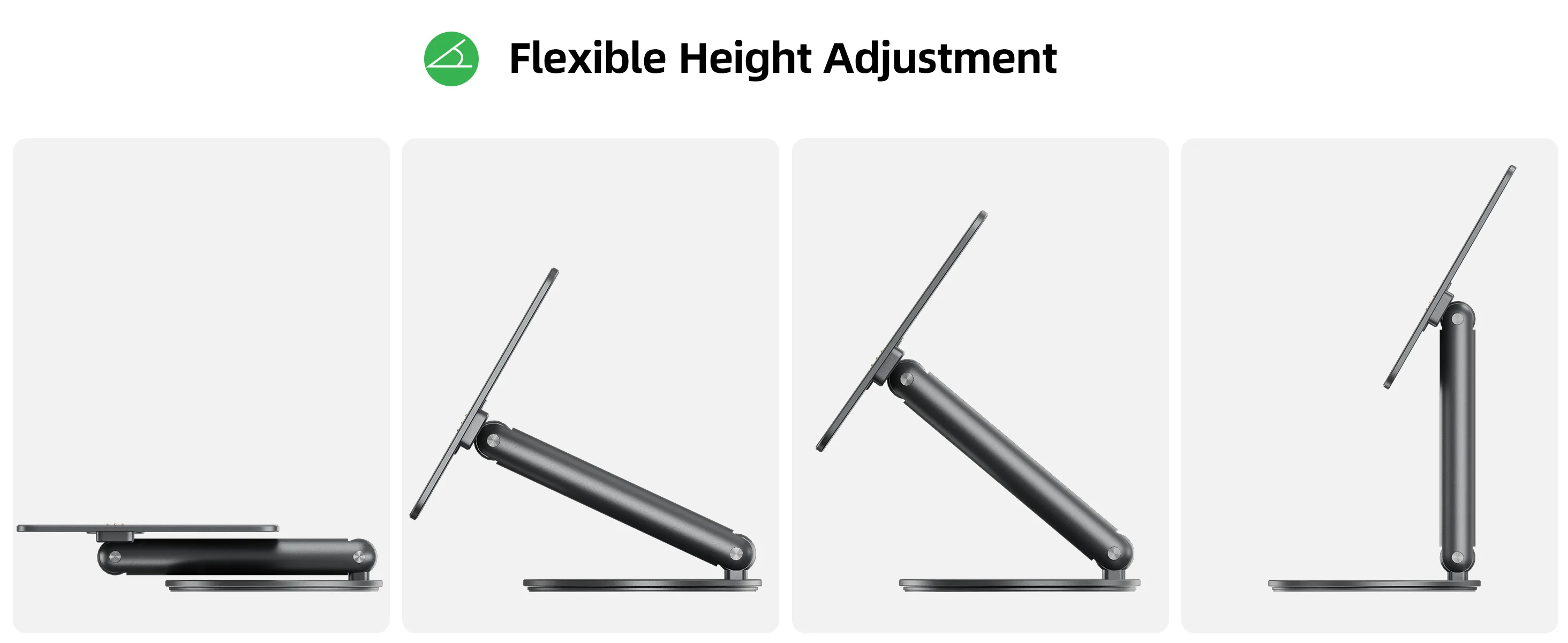 【Sturdy Aluminum Alloy Material】The portable stand for iPad Pro is made of aircraft-grade aluminum alloy, by CNC high-speed machining process, sandblasting and anodic oxidation treatment, increases the surface texture and durability. It has a thicker and larger base and a center of gravity design, while minimizing weight and giving full play to its stable and non-shaking characteristics. The aluminum stand fits perfectly with the style of the ipad pro!