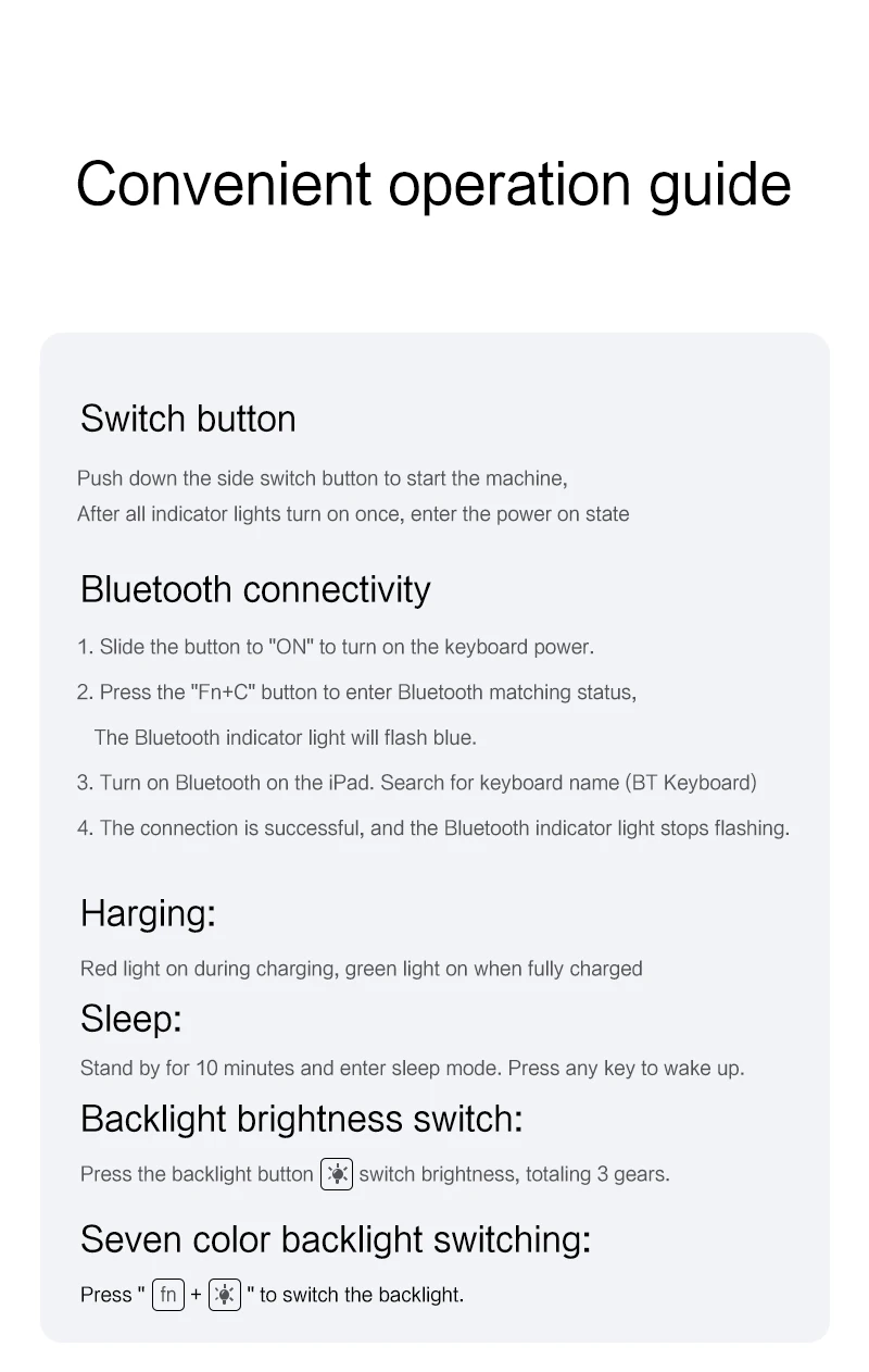 Note 3:After Open the Power, Please Click “Fn” and “C” 【Fn+C】Button Together to Open the Keyboard’s Bluetooth. It is Very Important.
