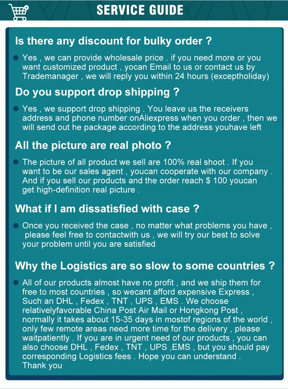 • If you did not receive the product within the guaranteed time( 45 days not including 2-5 day processing) you can request a refund or a reshipment.
